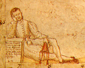 English: Laurence Nowell's self-portrait from his 1564 pocket atlas. Downloaded from http://tudorhistory.org/maps/ with modification (cropping)