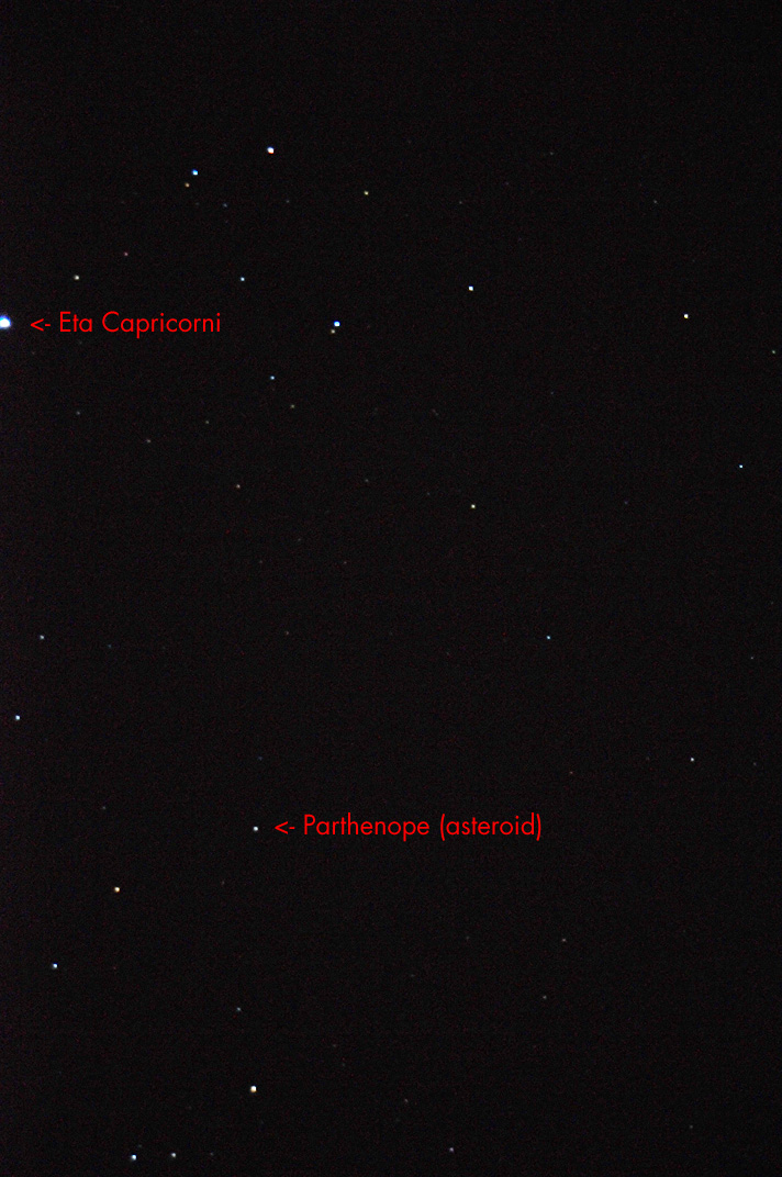 English: Parthenope asteroid imaged from San Francisco at Pt. Lobos through a 5" Schmidt-Cassegrain telescope, f10, 10 sec exposure, 1250mm focal length, iso 6400, nikon D300 camera prime