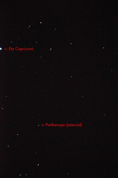 - 2008-10-28 15:43 Intandem 712×1072× (241106 bytes) {{Information |Description=Parthenope asteroid imaged from San Francisco at Pt. Lobos thru a 5" Schmidt-Cassegrain telescope, f10, 10 sec exposure, 1250mm focal length, iso 6400, nikon D300 camera prime |Source=I created this work entirely by myself. |Dat