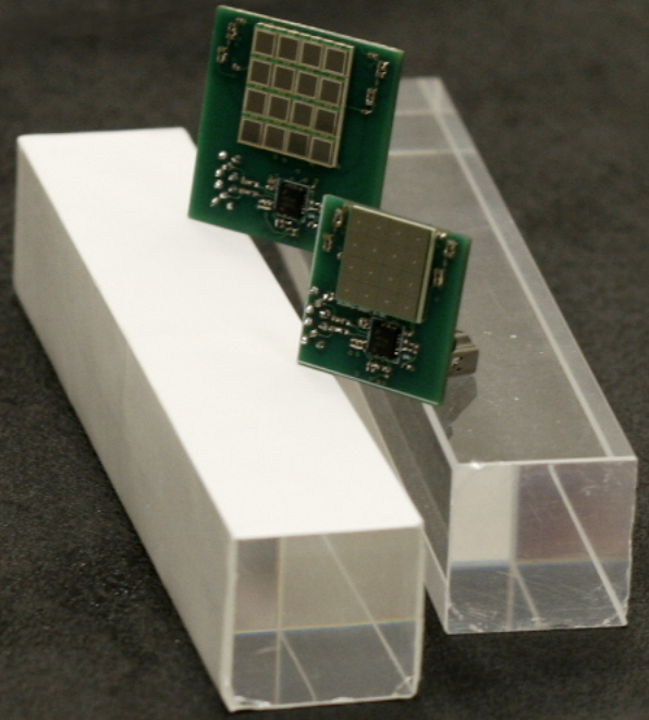 English: Sample 25 mm × 25 mm × 140 mm PbF2 crystals (bare and wrapped in Millipore paper) are pictured together with a 16-channel monolithic Hamamatsu SiPM.