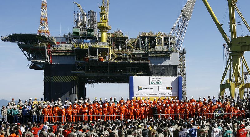 الرئيس آنذاك لويس إناسيو لولا دا سيلڤا في حفل افتتاح المنصة پ-52، بجانب عمال پتروبراس في أنگرا دوس ريس (ريو ده جانيرو).