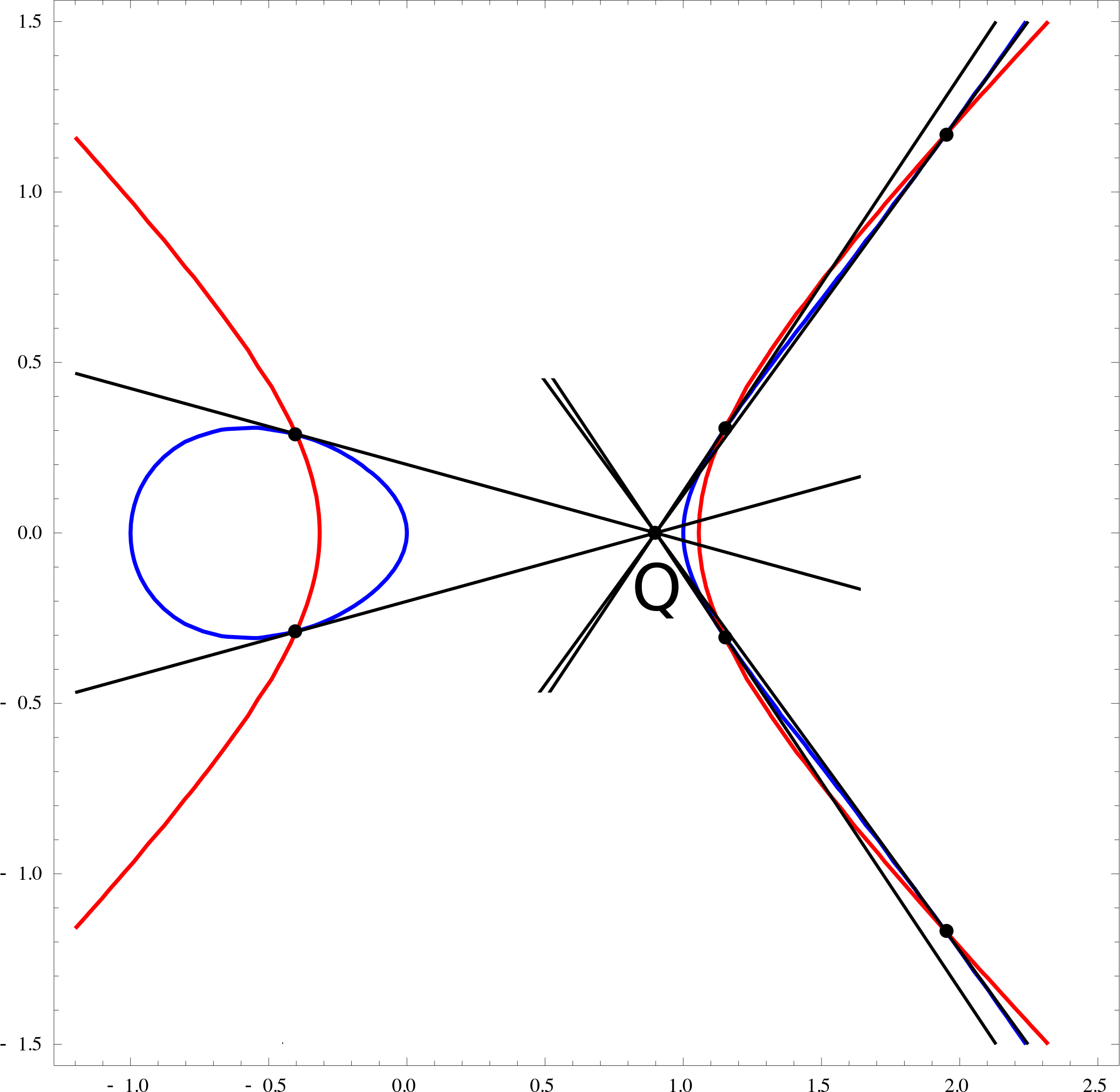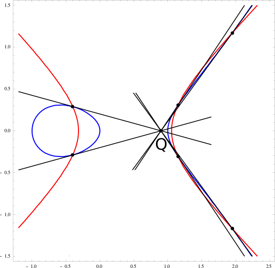 English: Elliptic curve, E, 4y^2=x(x-1)(x+1) (in blue) and its polar curve, C_Q, (in red) 4y^2=2.7x^2-2x-0.9 corresponding to the point Q=(0.9,0) (in homogeneous coordinates, Q=(0.9:0:1)). The 6 black lines are the tangents to points on E that go through Q.