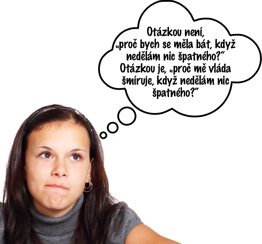 The question is not, "what do I have to worry about, if I am not doing anything wrong?" The question is, "why is the government spying on me, if I am not doing anything wrong?" (بالتشيكية)
