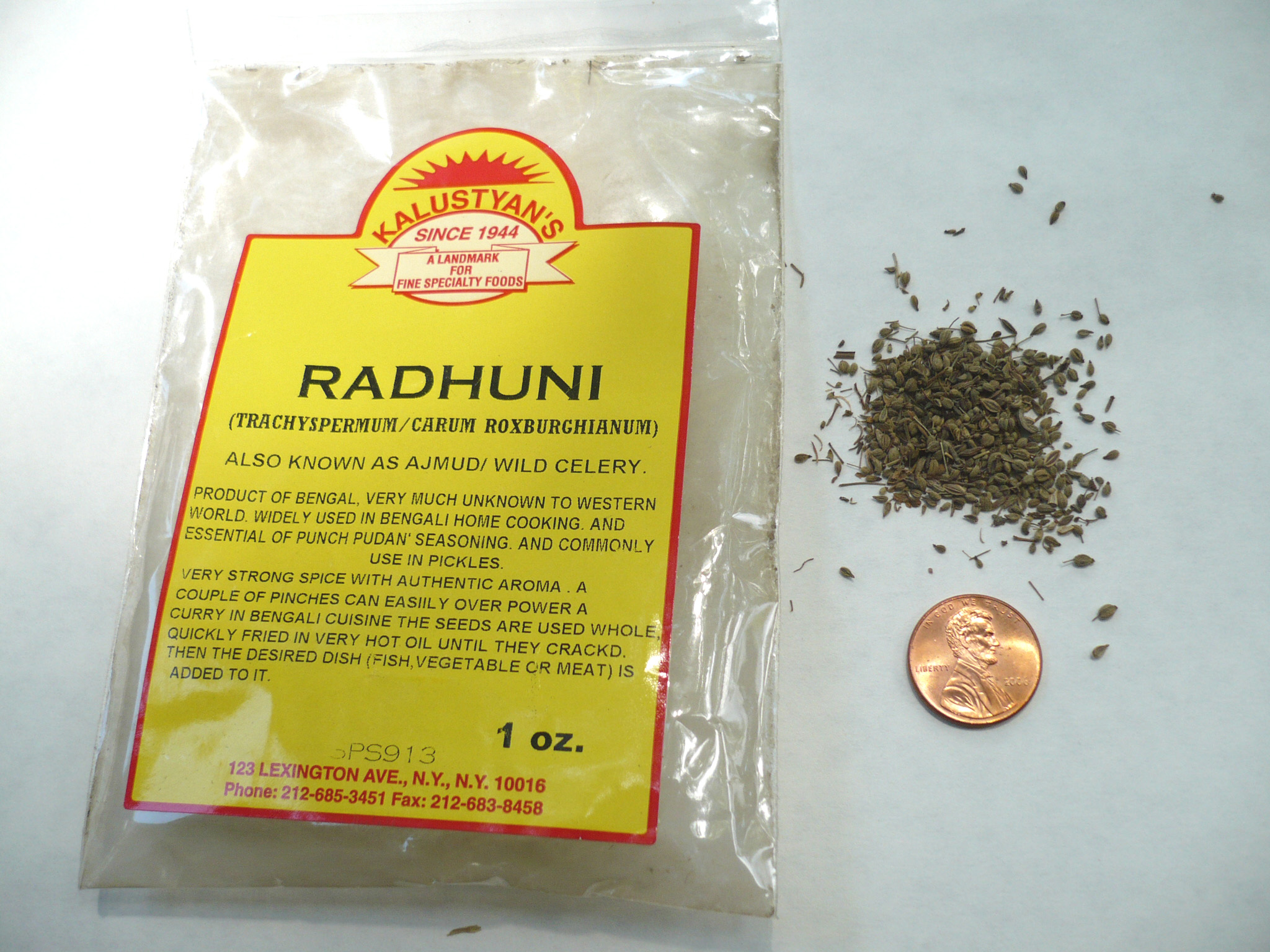 English: Radhuni seeds (right) and their package (left), with a United States penny for size comparison Photo taken in Kent, Ohio.