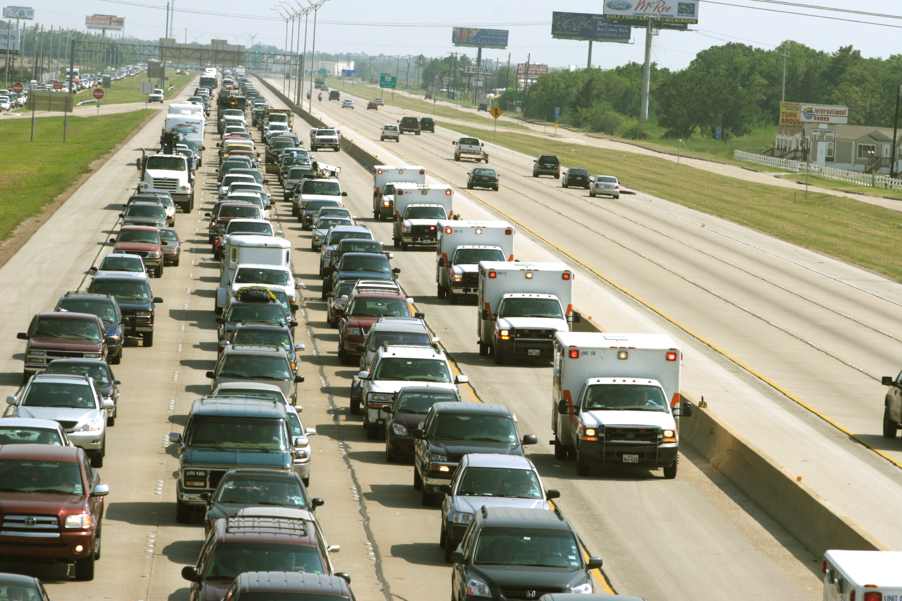English: Houston, TX, September 21, 2005 -- Traffic on I 45 was mostly out of town, to the north, as Galveston citizens evacuated the coastal flood plains. The recent landfall of Hurricane Katrina near New Orleans had people hurrying to prepare for Hurricane Rita. This picture was taken from the Calder Road overpass in League City, looking towards the southeast. The northbound traffic is from Galveston heading towards Houston and beyond.