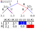 English: An image that shows the difference between strategies in subgame perfect Nash equilibria and plain NE's. The first player chooses Left or Right and the second player then chooses to be kind or unkind, however, following R unkind is a non-credible threat by 2.