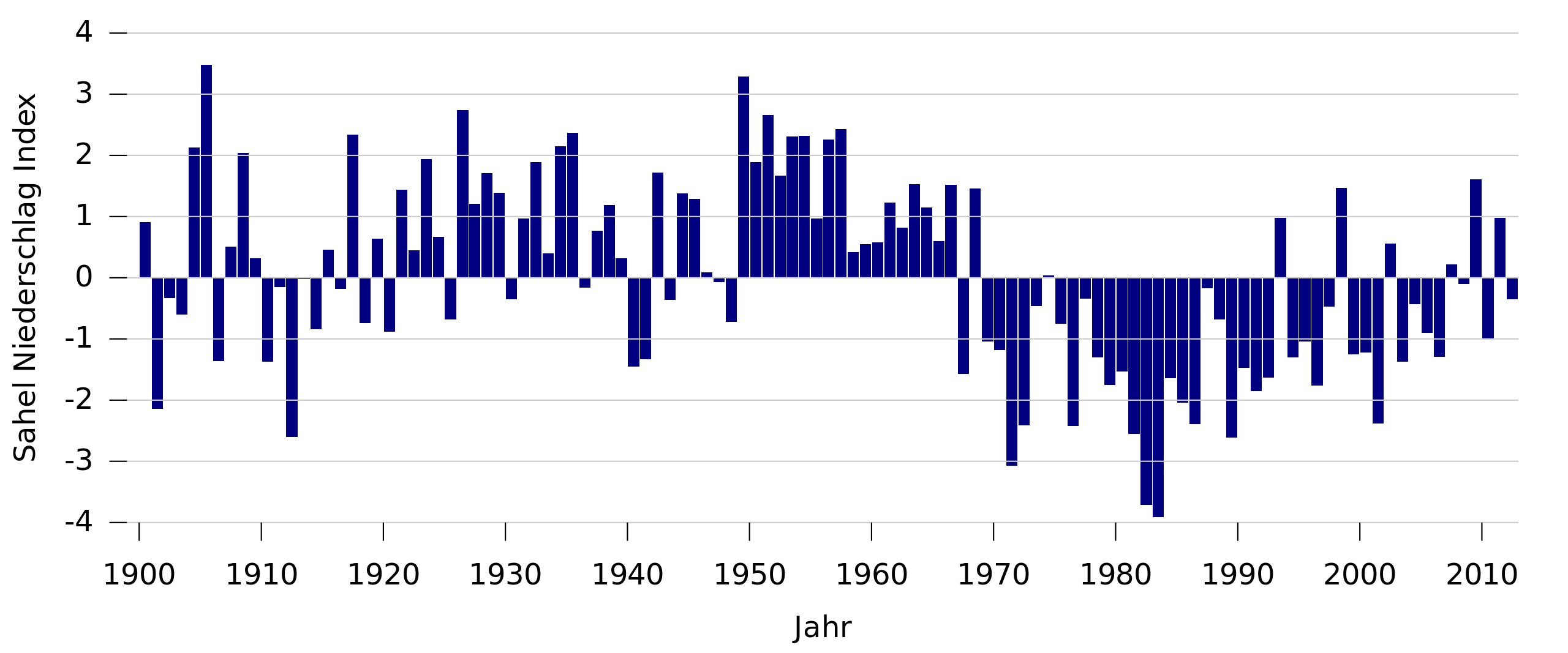English: More than a century of rainfall data in the Sahel show an unusually wet period from 1950 until 1970 (positive index values), followed by extremely dry years from 1970 to 1990 (negative index values). From 1990 until present rainfall returned to levels slightly below the 1898–1993 average, but year-to-year variability was high.