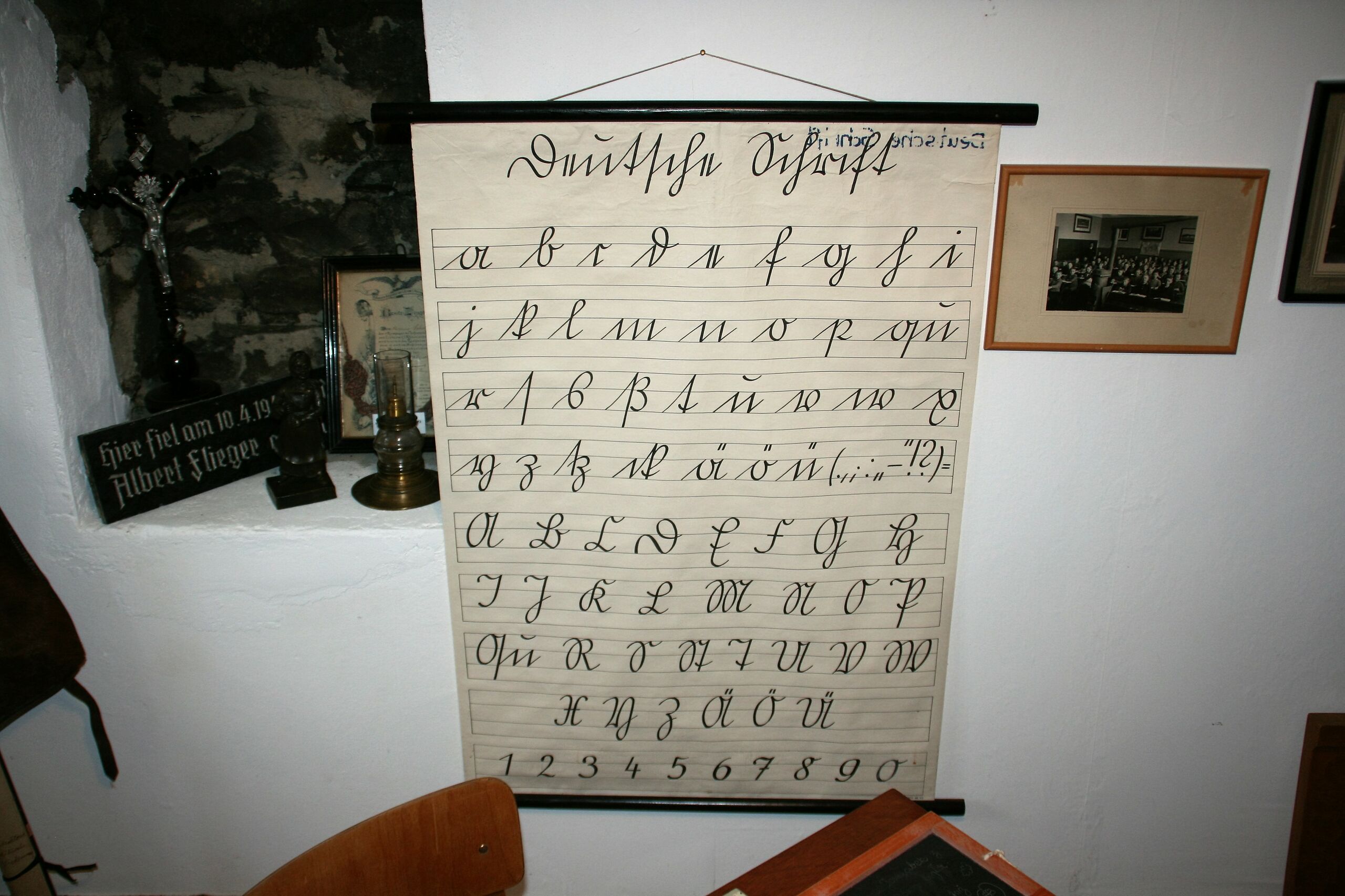 Deutsch: Schrifttafel "Deutsche Schrift" (Offenbacher Schrift) im Heimatmuseum Spieker in Herscheid (Märkischer Kreis)