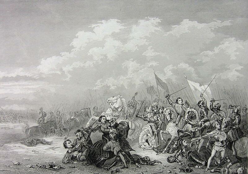 The Battle of Seminara (1495). This illustration, by an unknown nineteenth century artist, depicts a highlight of the battle -- nobleman Juan de Altavilla (right foreground, with shield) defends Ferdinand II of Aragon of Naples (behind Altavista, on dying white horse) from the French troops closing in on him. He will eventually give his horse to Ferdinand, and fight to the death delaying his pursuers. Ferdinand escaped to triumph in the campaign, only to die in 1496.