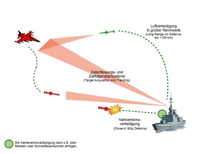 Deutsch: Da die Nahbereichsverteidigung sowohl durch Raketen (RAM), Geschütze oder andere Systeme erfolgen kann, ist die genaue Methode in der Darstellung offen gelassen worden. (deutschsprachige Fassung)