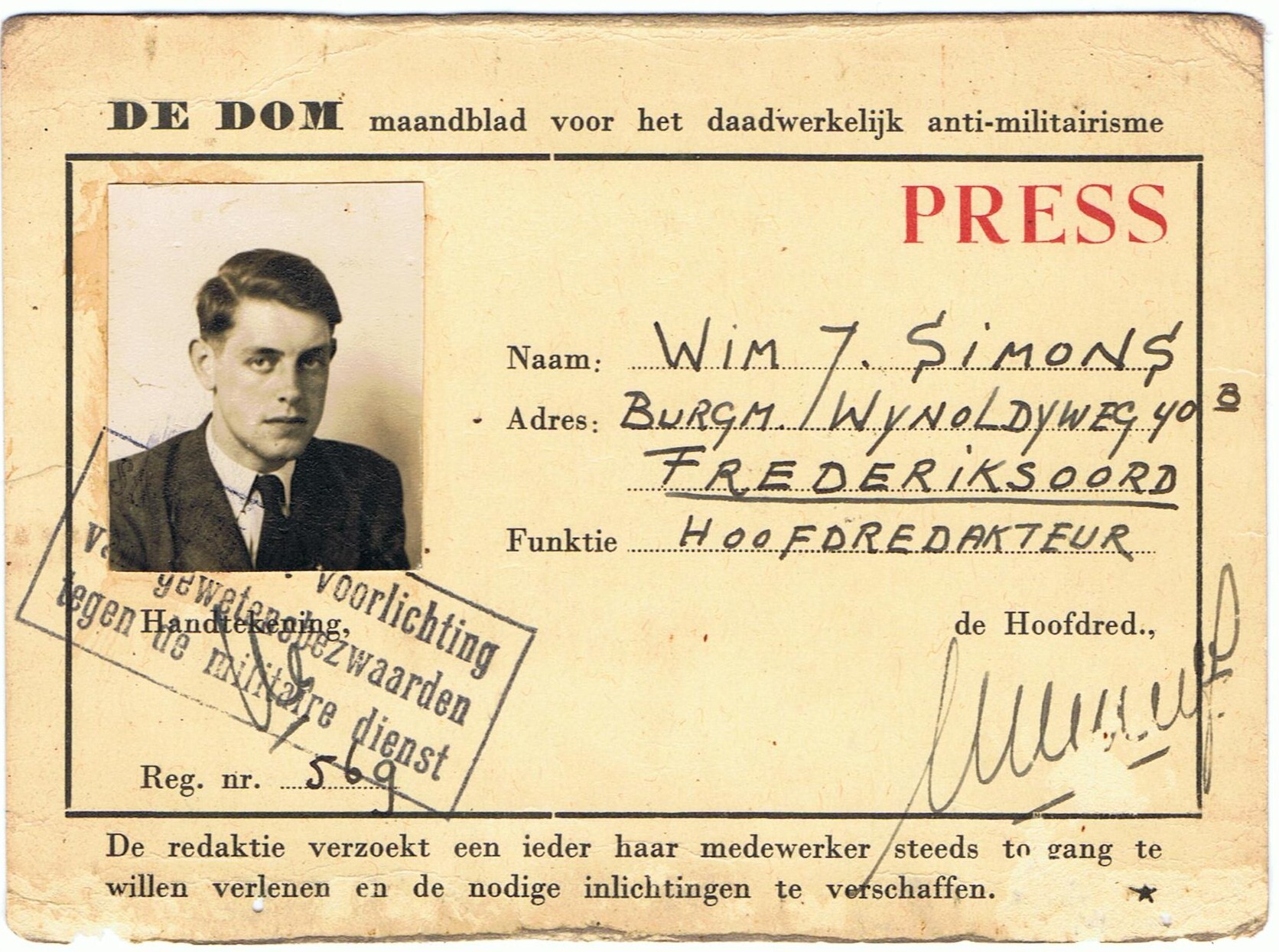 THE DOM monthly magazine for actual antimilitarism __________________________________________________ PRESS Name: Wim J. Simons Address: Burgm. Wynoldweg 40B Frederiksoord Function: Editor-in-Chief Signature, the Editor-in-Chief, [initialed] [signed] [stamped:] Foundation for providing information to conscientious objectors against military service Reg. no. 569 __________________________________________________ The editors request everyone to always grant their employee access and to provide the necessary information. |