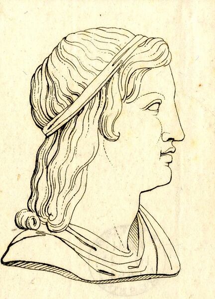 English: Portrait of Suetonius, head in profile to the right, with shoulder-length hair and band on hair; in rectangle; illustration to an unidentified publication titled 'Histoire Romaine'.