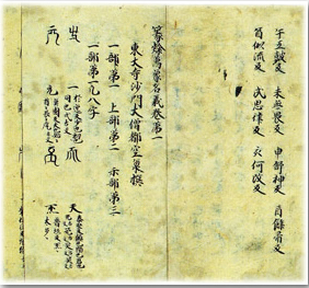 English: The myriad things, pronounced, defined, in seal script and clerical script (篆隷万象名義 Tenrei Banshō Meigi). Oldest extant Kanji dictionary. Transcription of the original by Kūkai from around 830–835. Start of first volume of six bound books by fukuro-toji[nb 2], ink on paper, 26.8 × 14.6 cm (10.6 × 5.7 in). Located at Kōzan-ji, Kyoto, Japan.