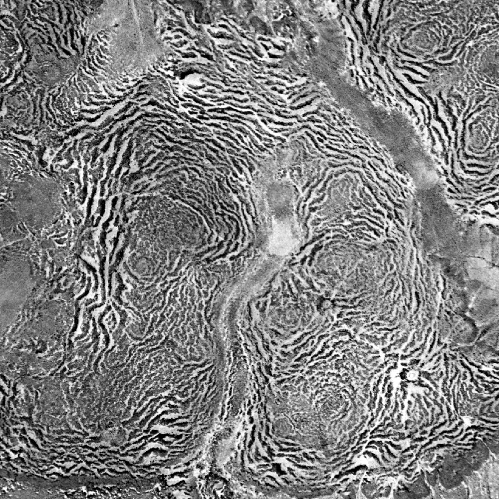 English: Vertical aerial view of a tiger bush plateau in Niger. Vegetation is dominated by Combretum micranthum and Guiera senegalensis. Image size : 5 x 5 km on the ground. Satellite image from the Declassified corona KH-4A national intelligence reconnaissance system, 1965-12-31.