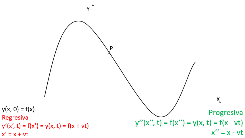 Español: En negro la onda en el instante t=0. En color verde la onda se propaga hacia la derecha, onda progresiva, y mantiene su forma en instantes t posteriores. En color rojo la onda se propaga hacia la izquierda, onda regresiva, y mantiene su forma en instantes t posteriores.