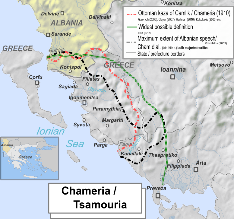 English: Map showing the various boundaries of Chameria/Tsamouria and the maximum extent of Albanian speech in late Ottoman Epirus