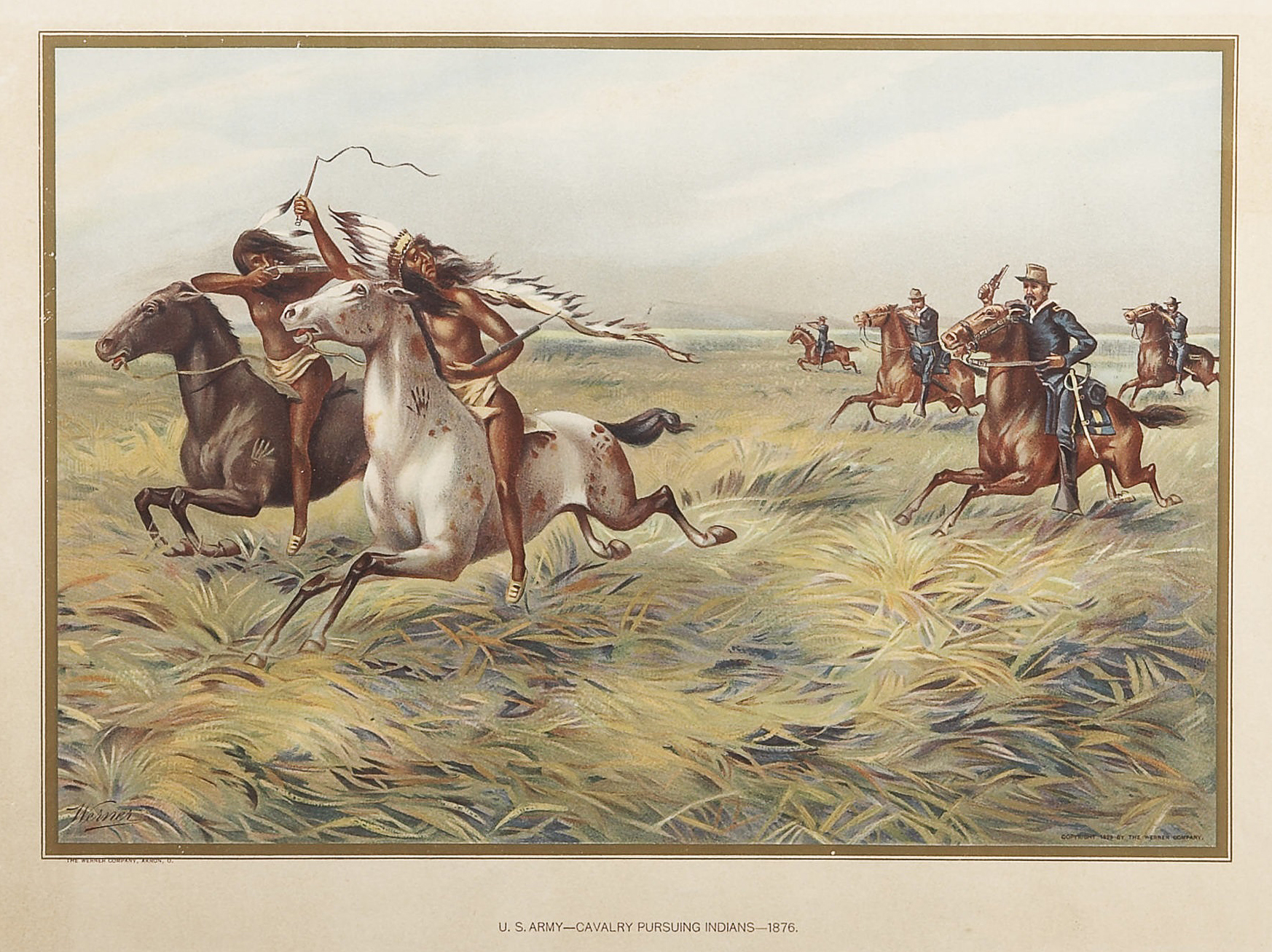 English: Lithograph "U.S. Army-Cavalry Pursuing Indians-1876", ca. 1899. This Werner lithograph of Cavalry Troops chasing Indians was printed in 1899. Very subdued colors, but in very fine condition. The frame measures 21"x 17" Image measures 17.5"x 13.5".