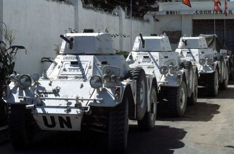 Caption: Ferret armored cars of the Nepalese Army, painted in the distinctive white of the United Nations, line the walls of the Napalese compound. Camera Operator: PV2 ANDREW W. MCGALLIARD Date Shot: 29 Dec 1993 "