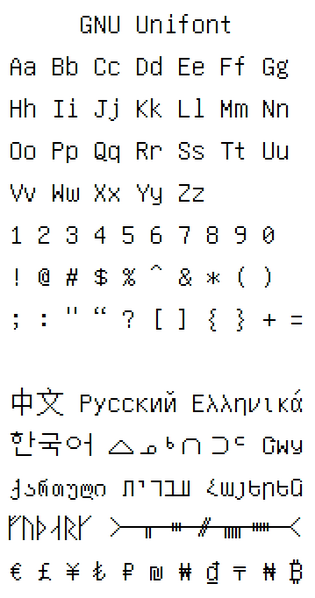 English: A sample of characters from GNU Unifont, version 12.0.01, including writing samples from 11 scripts and various currency symbols.