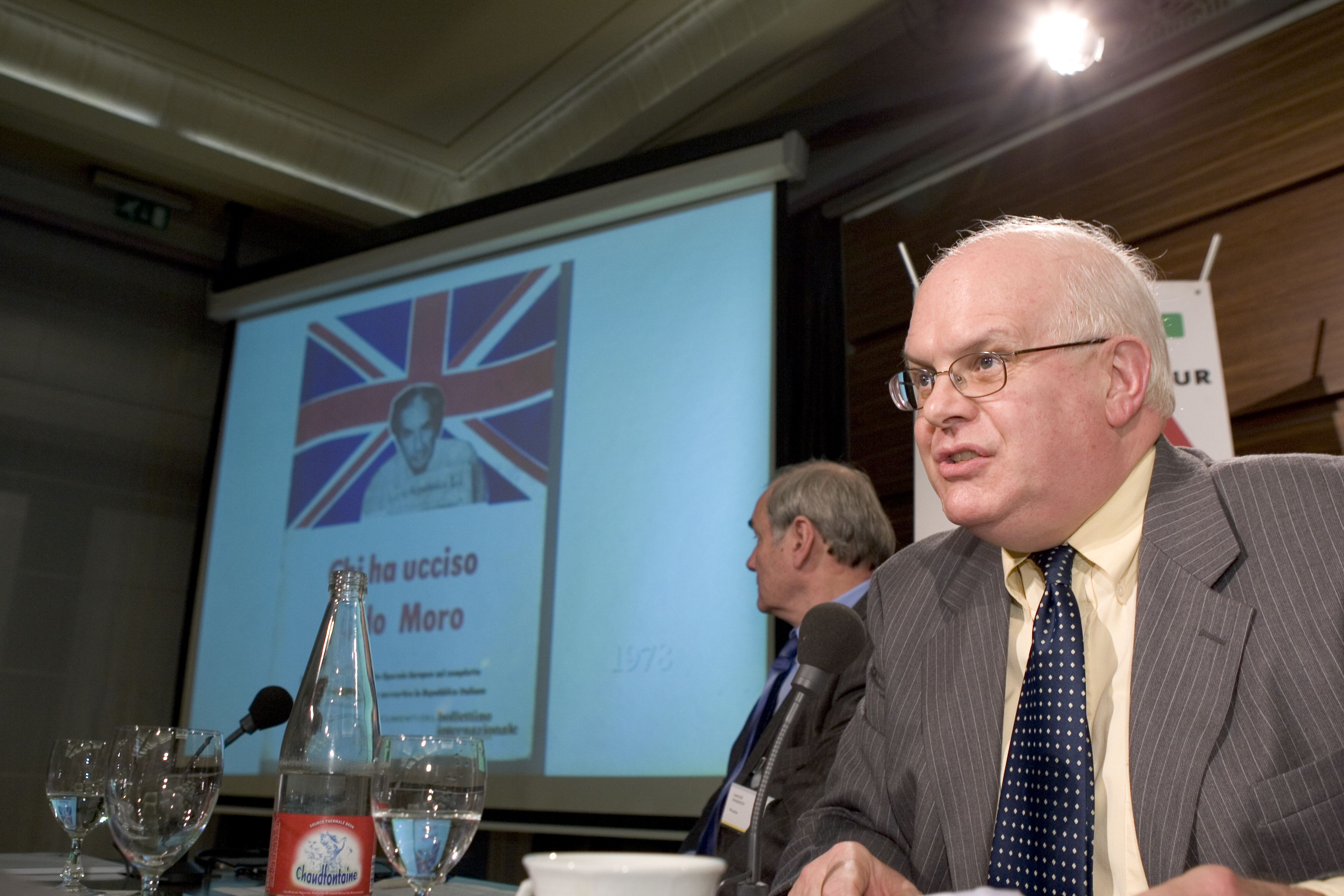 English: Webster Tarpley, author, journalist, lecturer, and critic of United States foreign and domestic policy, attending the Axis for Peace conference round table, 2005