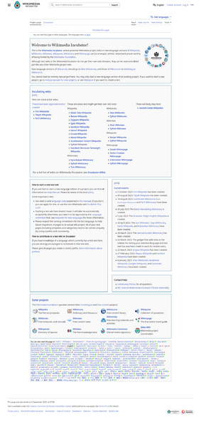 English: This is the snapshot of Wikimedia Incubator (21 Oct 2023), where potential Wikimedia project wikis in new-language versions of Wikipedia, Wikibooks, Wikinews, Wikiquote, Wiktionary and Wikivoyage can be arranged, written, tested and proven worthy of being hosted by the Wikimedia Foundation.