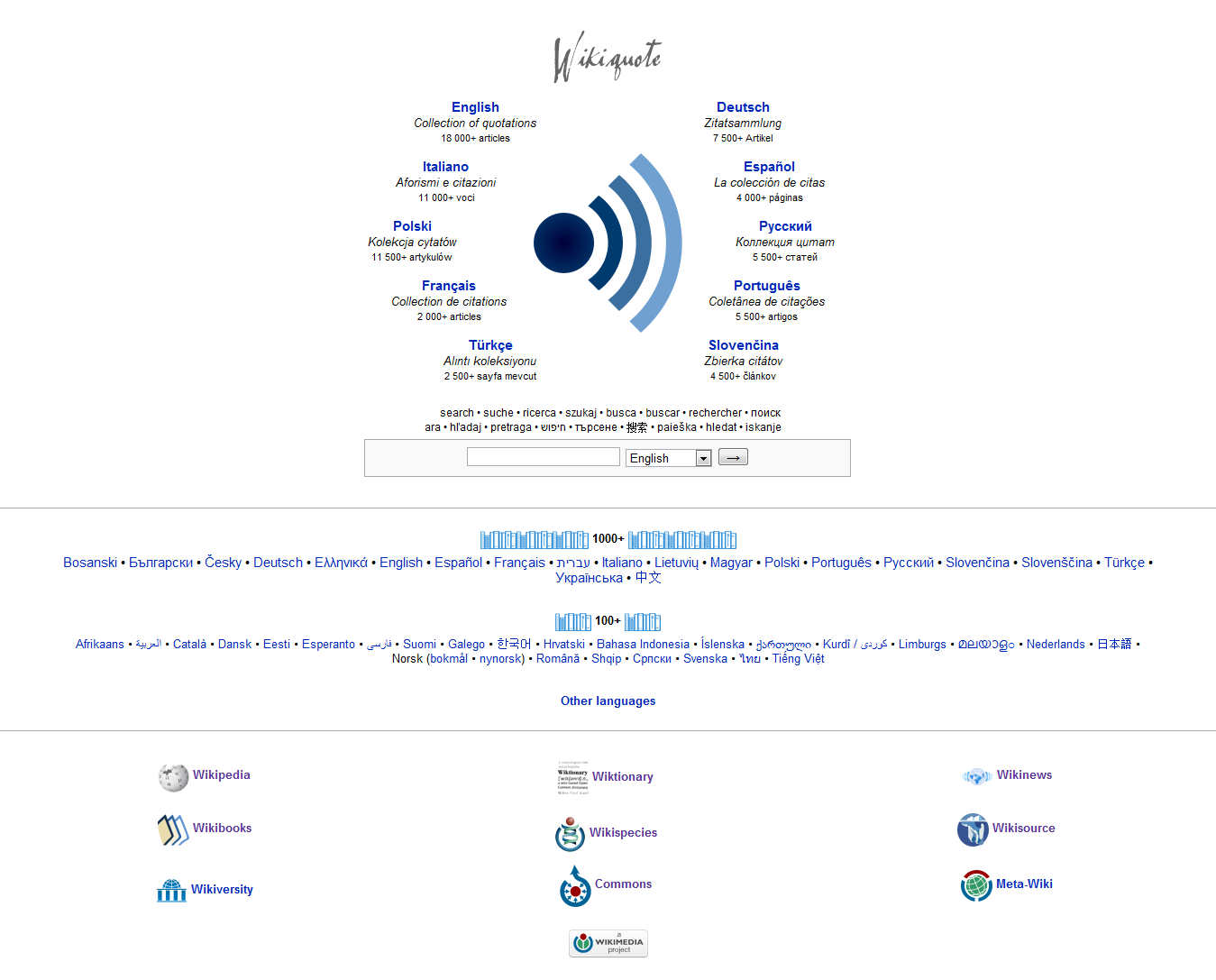 Screenshot of the multilingual Wikiquote portal (www.wikiquote.org) |