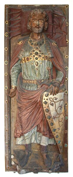 English: Tomb cover slab of count Wiprecht of Groitzsch (died 1124). Saxony, second quarter of the 13th century. Replica of the sandstone orignal from the St. Laurence's Church in Pegau. The colorful appearance of the cast reproduces the polychroming of the original tomb in 1869, which was stripped off again in 1934/35. Germanisches Nationalmuseum.