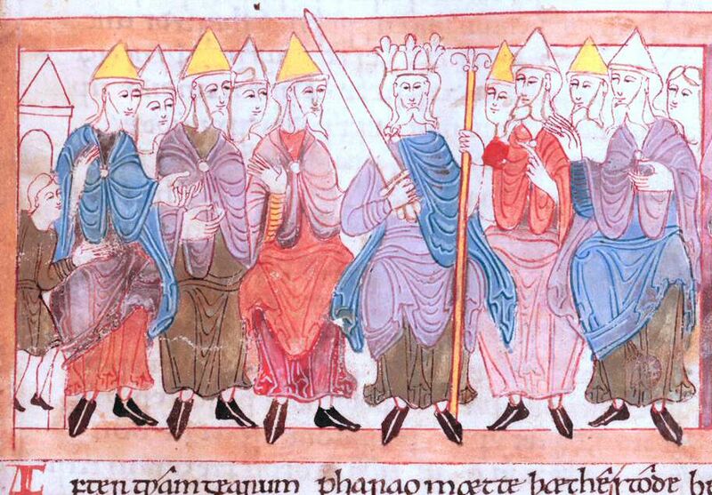 An image of a king and his witan - from the eleventh-century Old English Hexateuch [British Library]