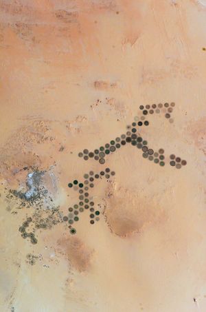 صورة من الفضاء لحقول الري المركزي في واحة الكفرة، ليبيا. الصورة التقطها مرصد الأرض على متن المحطة الفضائية الدولية 28 اكتوبر 2004. كل حقل دائري قطره كيلومتر واحد. الدوائر الغامقة تشير لمحاصيل شعير وبرسيم (ألفا ألفا) لم يتم حصادها بعد. الدوائر الفاتحة هي حقول تم حصادها أو غير مستعملة.