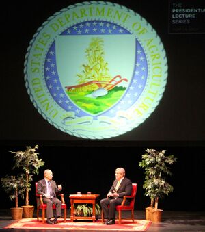 رئيس جامعة پردو ميتش دانيالز يتحدث مع وزير الزراعة توم ڤيلساك في 2014