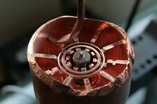 نموذج راندال وبوت الأولي لأنبوب المغنطرون المجوف في جامعة برمنگهام، عام 1940. قيد الاستخدام، تم تركيب الصمام بين قطبي المغناطيس الكهربائي.
