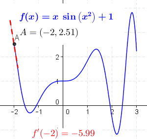 Its value at a point on the function gives us the slope of the tangent at that point. For example, let y = x2. A point on this function is (−2,4). The derivative of this function is dydx = 2x. So the slope of the line tangent to y at (−2,4) is 2 ⋅ (−2) = −4. The equation of this tangent line is: y − 4 = (−4)(x − (−2)) or y = −4x − 4.