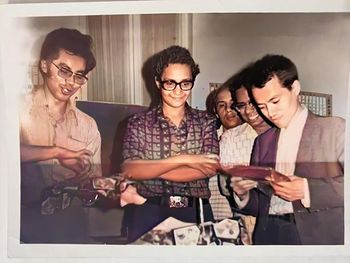 نايل الشافعي (16 سنة، وسط الصورة) بين أستاذيه تسونيو ناگاي (يسار، حالياً رئيس وكالة أنباء كيودو) وأشرف ياسوي، يقدم لهما هدايا، نيابة عن الفصل بمناسبة انتهاء العام الأول لأول دفعة لدراسة اللغة اليابانية في المركز الثقافي الياباني، الملحق بسفارة اليابان، بحي جاردن سيتي، القاهرة، مطلع مايو 1975. استمر نايل في دراسة اليابانية لست سنوات.
