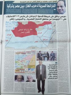 الخرائط السرية لحرب الغاز بين مصر وتركيا، جريدة الوطن، 8 أبريل 2015. العنوان الرئيسي للصفحة الأولى ويغطي كذلك صفحتين متقابلتين داخل الصحيفة.