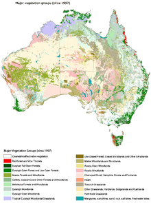 وتتتناقص الأمطار كلما نتجه إلى الداخل ، تحل الصحراء محل أشجار الكافور والسنط وحينما تكون الصحراء رملية توجد فيها أجمات صغيرة من حشائش ذات أوراق حادة مثل حشيش القنف وحشيش القصب ، وفي غير هذه الأماكن يوجد نوع من الحياة النباتية يسمى شجيرات الملح ، وفي هذه البيئة تؤدي شدة تبخر الماء إلى تمليح التربة ، والنباتات الوجدية التي تنمو فيها هيا نباتات البيئة المالحة ، وهي نباتات مكيفة على الحياة في الأماكن التي يكثر فيها الملح. يوجد في بابندا الواقعة على الساحل الشمالي لأستراليا أفضل أماكن المطر ، إذ يبلغ مقداره 160 بوصة في السنة ، وتبلغ كميته في أودوناداتا الواقعة وسط القارة حوالي أربع بوصات أو أقل بمقدار أربعين مثلا!