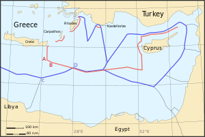المطالبات المتضاربة على الرصيف القاري ومناطق المنطقة الاقتصادية الخالصة في شرق البحر المتوسط. الأزرق: المناطق التي تطالب بها اليونان وقبرص؛ الأحمر: المناطق التي تطالب بها تركيا. قسم بعنوان "A-B": الترسيم المزعوم بين تركيا وليبيا وفقًا لاتفاقية نوفمبر 2019. قسم بعنوان "C-D": الترسيم المتفق عليه بين اليونان ومصر وفقًا لاتفاقية أغسطس 2020.