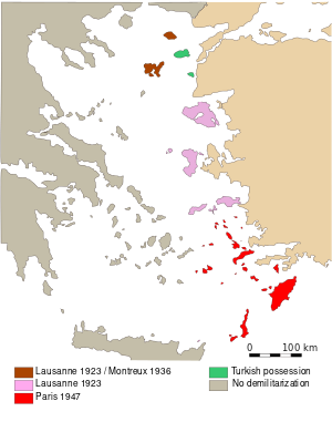 These islands were placed under a demilitarization statute by the Treaty of Lausanne in 1923, to counterbalance the simultaneous demilitarization of the Turkish straits area (the Dardanelles and Bosphorus), Imbros and Tenedos. The demilitarization on the Turkish side was later abolished through the Montreux Convention Regarding the Regime of the Turkish Straits in 1936. Greece holds that, by superseding the relevant sections of the earlier treaty, the convention simultaneously lifted also the Greek obligations with respect to these islands. Against this, Turkey argues that the Montreux treaty did not mention the islands and has not changed their status.[4] Greece, on the other hand, cites Turkish official declarations, by the then Turkish Minister for Foreign Affairs, Rustu Aras, to that effect made in 1936,[322] assuring the Greek side that Turkey would consider the Greek obligations lifted.[5]