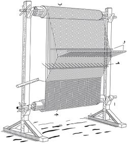 أما النول الذي نستعمله اليوم فقد روعي فيه إمكانية نسج أقمشة أطول من التي تنسج على الأنوال السابقة (الشكل 6). ويتكون هذا النول من أسطوانتين مركبتين على قائمين متوازيين. تلف الأسدية على الأسطوانة الأولى (ب)، ويلف المنسوج على الأسطوانة الثانية المقابلة (جـ)، والأسطوانتان متحركتان ليسهل لف الأسدية والمنسوج عليهما.