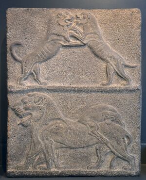 Canaanite relief in basalt depicting a lion and a lioness at play, 14th century BCE