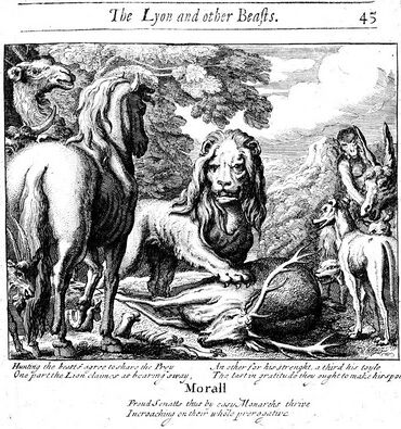 The early Latin version of Phaedrus[4] begins with the reflection that "Partnership with the mighty is never trustworthy". It then relates how a cow, a goat and a sheep go hunting together with a lion. When it comes to dividing the spoil, the lion says, "I take the first portion because of my title, since I am addressed as king; the second portion you will assign to me, since I’m your partner; then because I am the stronger, the third will follow me; and an accident will happen to anyone who touches the fourth." This was listed as Fable 339 in the Perry Index[5] and was later the version followed by William Caxton in his 1484 collection of the Fables.[6]
