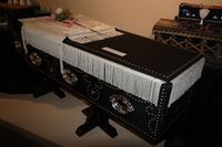 The handles and other ornaments (such as doves, stipple crosses, crucifix, symbols etc.) that go on the outside of a coffin are called fittings (sometimes called 'coffin furniture' – not to be confused with furniture that is coffin shaped) while organizing the inside of the coffin with fabric of some kind is known as "trimming the coffin".