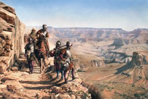 In Arizona, the river passes Lee's Ferry, an important crossing for early explorers and settlers and since the early 20th century the principal point where Colorado River flows are measured for apportionment to the seven U.S. and two Mexican states in the basin.[24] Downstream, the river enters Marble Canyon, the beginning of the Grand Canyon, passing under the Navajo Bridges on a now southward course. Below the confluence with the Little Colorado River, the river swings west into Granite Gorge, the most dramatic portion of the Grand Canyon, where the river cuts up to واحد ميل (1.6 km) into the Colorado Plateau, exposing some of the oldest visible rocks on Earth, dating as long ago as 2 billion years.[25] The 277 ميل (446 km) of the river that flow through the Grand Canyon are largely encompassed by Grand Canyon National Park and are known for their difficult whitewater, separated by pools that reach up to 110 أقدام (34 m) in depth.[26]
