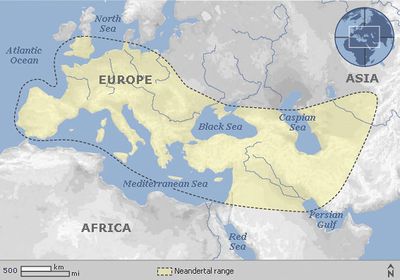 رسم توضیحي لأماكن إنتشار النياندرتال والفروقات بينه وبين الانسان الحالي