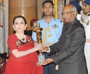 For her initiatives on grassroot sports, Ambani received the 'Rashtriya Khel Protsahan Award 2017' from then-President of India.[70][71] She is the recipient of Best Corporate Supporter of Indian Sports award, given by the Times of India.[72][73][74]