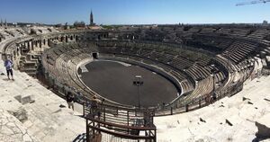 Dubbed the most Roman city outside Italy,[3] Nîmes has a rich history dating back to the Roman Empire when the city was a regional capital, and home to 50,000–60,000 people.[4][5][6][7] Several famous monuments are in Nîmes, such as the Arena of Nîmes and the Maison Carrée. Because of this, Nîmes is often referred to as the French Rome.