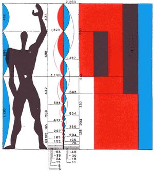 لو كوربوزييه سعى إلى وضع " قياس توافقي عالمي" ، في كتابة "Modulor" الذي حاول التدليل على وجود علاقة بين أبعاد الجسم البشري ، والنسبة الذهبية. المودولار (Modulor) هو أداة قياس تعتمد على قامة الإنسان والرياضيات. رجل بذراع مرفوع يعرض النقاط الرئيسية في الفراغ (1949). لو كوربوزييه صنع شريط قياس متري (المتر) مقسم الى مجموعتين مستمدة من حساباته ، سلسلة حمراء و سلسلة زرقاء ، بهذه النسب يمكن قياس أجمل المباني في التاريخ التي اعتمدت فيها النسبة الذهبية في الأجزاء وفي الكل. [4]