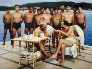 الرئيس ماو تسي تونج والرئيس الفيتنامي هو تشي منه في منتجع شاطئ بيداي هي، أغسطس 1960. في ذلك الوقت، لم يكن للصين مقعد في الأمم المتحدة، وكانت حرب فيتنام بعيدة كل البعد عن النهاية.