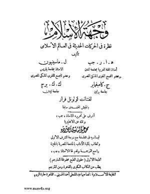 وجهة الإسلام نظرة في الحركات الحديثة في العالم الإسلامي تأليف هـ.ا.ر. جب ،ل. ماسينيون، ج. كامبفماير ، ك.ك. برج ، النقيب فيرار نقله عن الانجليزية: محمد عبد الهادي أبو ريدة. أشهر المستشرقين على الاطلاق يجتمعون لصياغة رؤية موحدة.