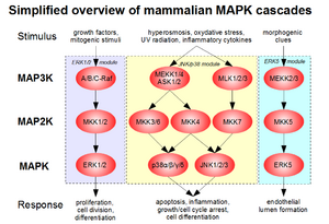 Genetic studies show that specific gene mutations or deletions are causes for the disease. The genes identified for cerebral cavernous hemangiomas (or malformations), are CCM1 (also KRIT1), CCM2 (also MGC4607, malcavernin) and CCM3 (also PDCD10). The loss of function of these genes is believed to be responsible for cerebral cavernous malformations.[17] Furthermore, it is also believed that a "second hit mutation" is necessary for the onset of the disease. This means that having a mutation in one of the two genes present on a chromosome is not enough to cause the cavernous malformation, but mutation of both alleles would cause the malformation. Additionally, research on hemangiomas in general has shown that loss of heterozygosity is common in tissue where hemangioma develops.[18] This would confirm that more than a single allele mutation is needed for the abnormal cell proliferation. KRIT1 has been shown to act as a transcription factor in the development of arterial blood vessels in mice. CCM2 has overlapping structure with CCM1 (KRIT1) and acts as a scaffolding protein when expressed. Both genes are involved with MAP3K3 and thus appear to be a part of the same pathway.