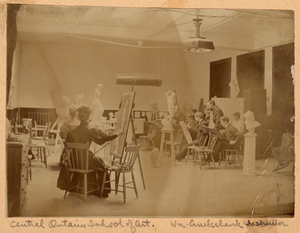 It has been suggested that around 1906 or 1907, Tom Thomson took private lessons from Cruikshank at the Ontario College of Art and Design.[12] Only two sources corroborate this however. The first is a single undated note from Cruikshank to professor James Mavor, arranging to bring a "Tomson" [ك] to meet him.[13] Further complicating the matter is that the original class list no longer survives.[14] The second is a letter from H. B. Jackson to Blodwen Davies, writing, "Tom studied from life & the antique in art school. If I remember right Cruikshank was the instructor."[15] Cruikshank was likely Thomson's only art instructor in an art school.[16]
